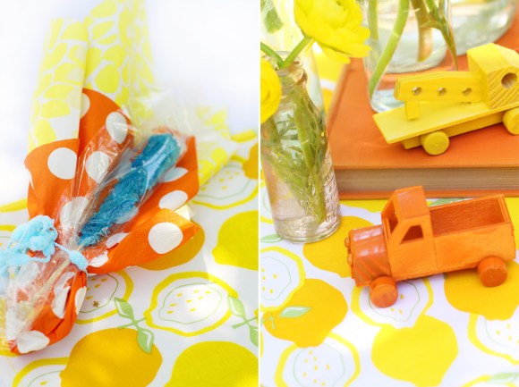 Teal, Bright Yellow and Orange were the colors of choice and from the lemons took over every detail. From the delicious homemade lemon curd party favors, and lemon meringue tarts (made by Maria’s sister-in-law and friend), to the lemon tablecloths and the fresh squeezed lemonade stand – it was the perfect summer party!”