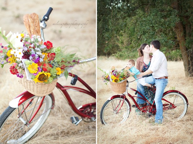 Such a styling little guy! Very nice, fun photos! The bike and basket of blooms is very pretty…so cute of the baguette munching!